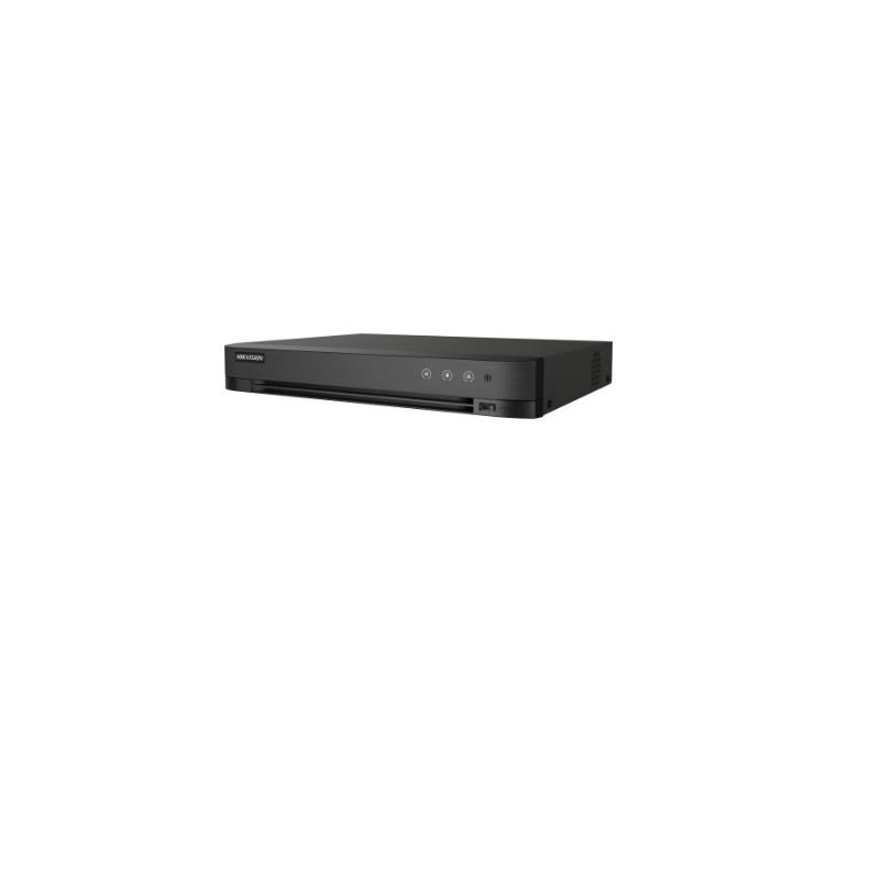 DVR pentahíbrido: HD-TVI / HD-CVI / Analogico / IP / AHD. 4 canales TURBOHD + 4 canales IP = 8 canales en total (u 8 canales IP en total, apagando los canales analógicos). Grabación: 8 MPx@8 fps/3K/5Mpx@12 fps1080p@25 fps. Compatible con Hik-Connect P2P. 1 entrada y 1 salida de audio (para micrófono y parlante externo). Soporta 1 HDD de hasta 10 TB (no incluido). Interfaz serial: RS-485 (HIKVISION C, COAXITRON, PELCO D, PELCO P, etc). Compresión: H.265+ / H.265 / H.264. Salida de video simultáneo en HDMI (2K) y VGA (1080p). Alimentación: 12 Vcc (fuente incluida). Consumo sin HDD: 18 watts. Temperatura de operación: -10 ºC hasta 55 ºC. Dimensiones: 315 x 242 x 45 mm (W × D × H). Peso: 1.78 Kg sin HDD. Resolución máxima 4K (8 MP). Soporta audio de dos vías por coaxitron. Soporta reconocimiento facial en 2 canales de video, compatible solo con cámaras TURBOHD (el analítico lo hace el DVR, puede ser cualquier cámara TURBOHD). Soporta 2 canales con tecnología ACUSENSE, permite filtrar por analítica de cruce de línea o intrusión de área humanos o vehículos para activar un evento o grabación. Soporta en todos los canales con tecnología ACUSENSE Lite, permite filtrar por detección de movimiento humanos o vehículos para activar un evento o grabación.